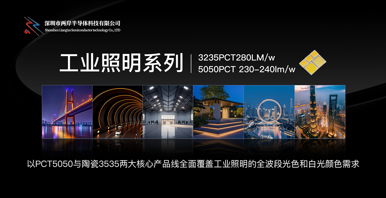 兩岸半導體有限公司深耕工業照明領域,以PCT5050與陶瓷3535兩大核心產品線全面覆蓋工業照明的全波段光色和白光顏色需求。其中PCT5050系列表現尤為突出,PCT5050以高性價比普及高效節能,通過成熟的技術和材料,實現了優異的成本控制。其光效已達到行業領先水平,單顆光源出光效率可達230-240lm/w ( 45mA /22-23V),能夠幫助工業項目替代老舊高耗能燈具,實現節能80%。通過集成化拓展智能與多功能場景,應用于各種照明場景,也可以將紅、綠、藍三種芯片集成于一顆5050燈珠內,能夠輕松實現全彩變化、色溫調節和智能控制,為工業照明中需要氛圍指示、分區照明或與智能管理系統聯動的場景提供了高性價比的解決方案。